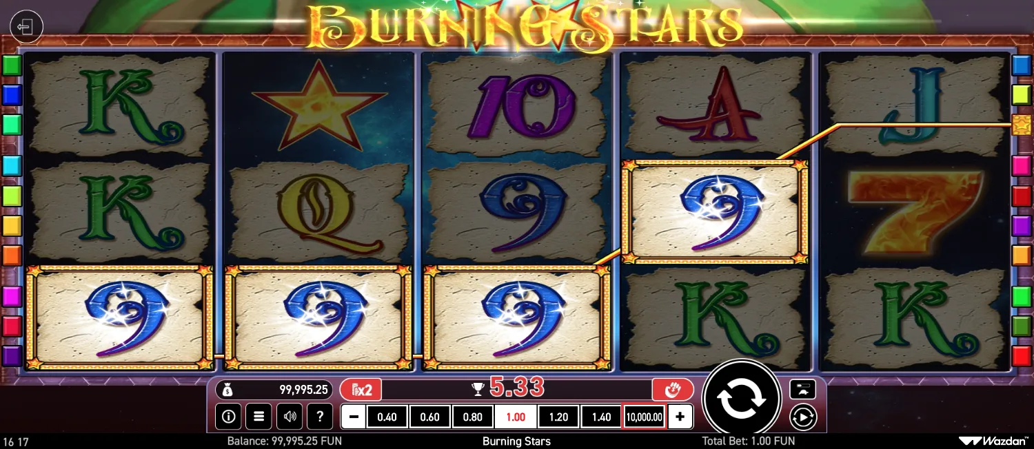 Burning Stars is classified as a low-med volatility slot. This means that you can expect more frequent but smaller wins, making it ideal for extended play sessions with a smaller bankroll.