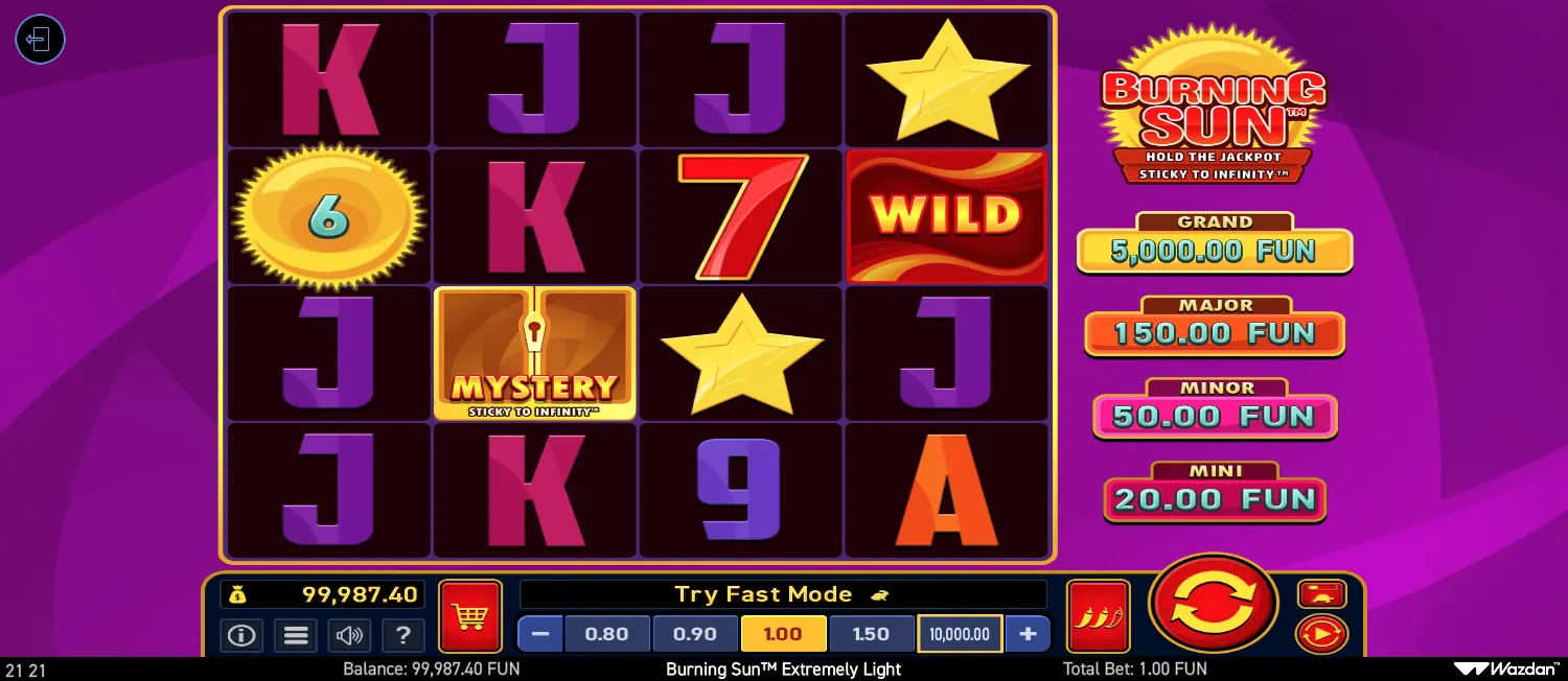 Play Burning Sun Extremely Light slot for free in demo mode. 96.12% RTP, Variable volatility, 5000x max win.