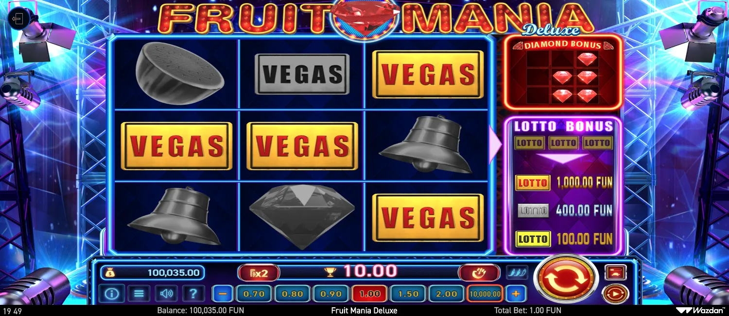 Play Fruit Mania Deluxe slot for free in demo mode. 96.59% RTP, Variable volatility, 1000x max win.