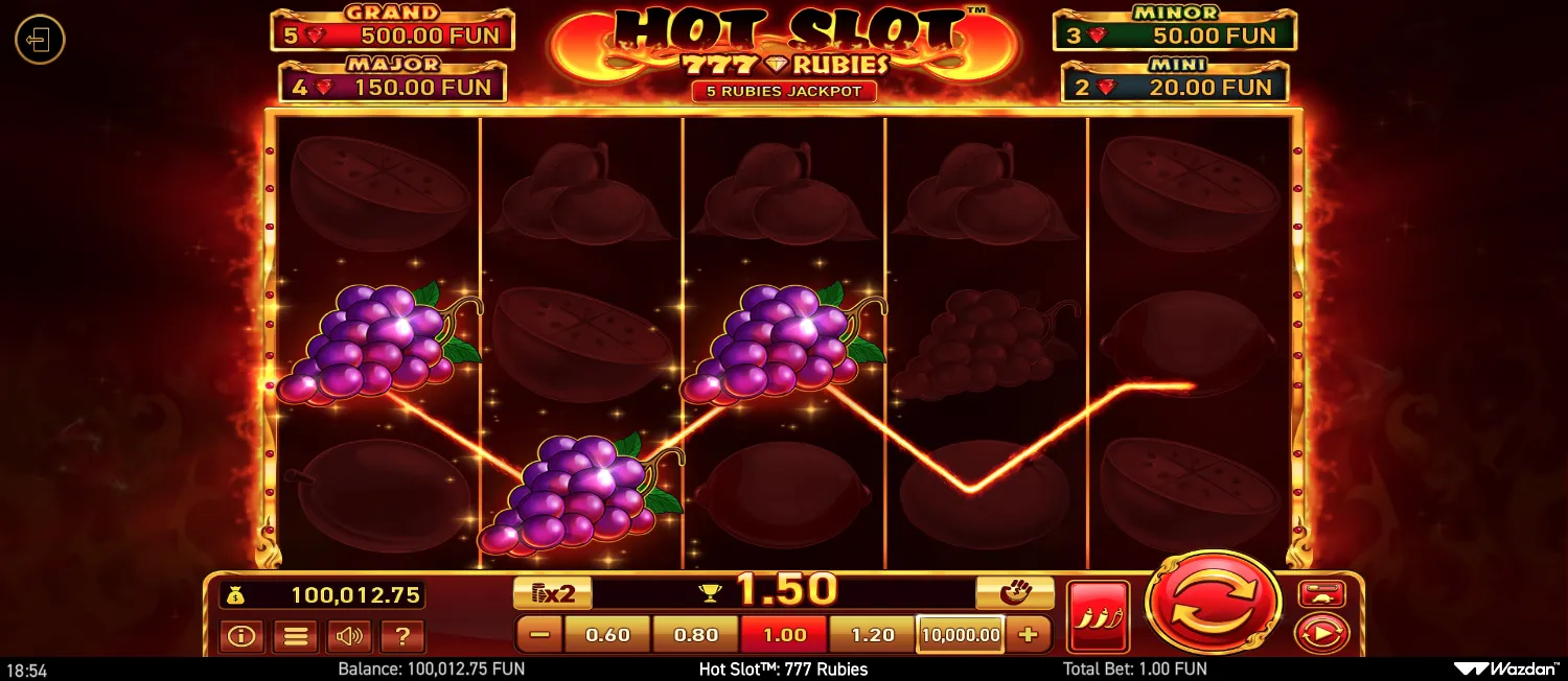 Yes! You can play Hot Slot: 777 Rubies in demo mode completely free without registration. The free demo version includes all game features, bonus rounds, and mechanics, allowing you to test the game before playing with real money.