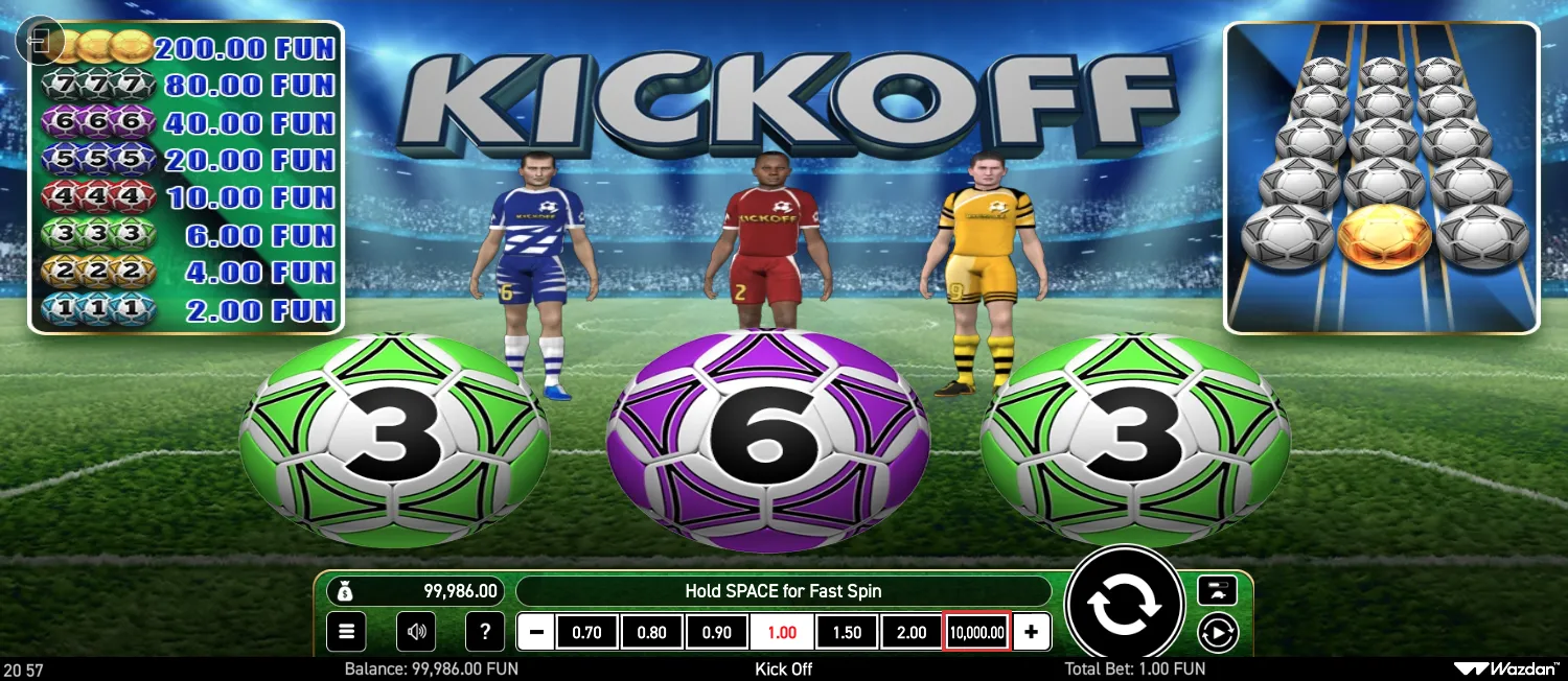 KickOff is classified as a med volatility slot. This means that you can expect more frequent but smaller wins, making it ideal for extended play sessions with a smaller bankroll.