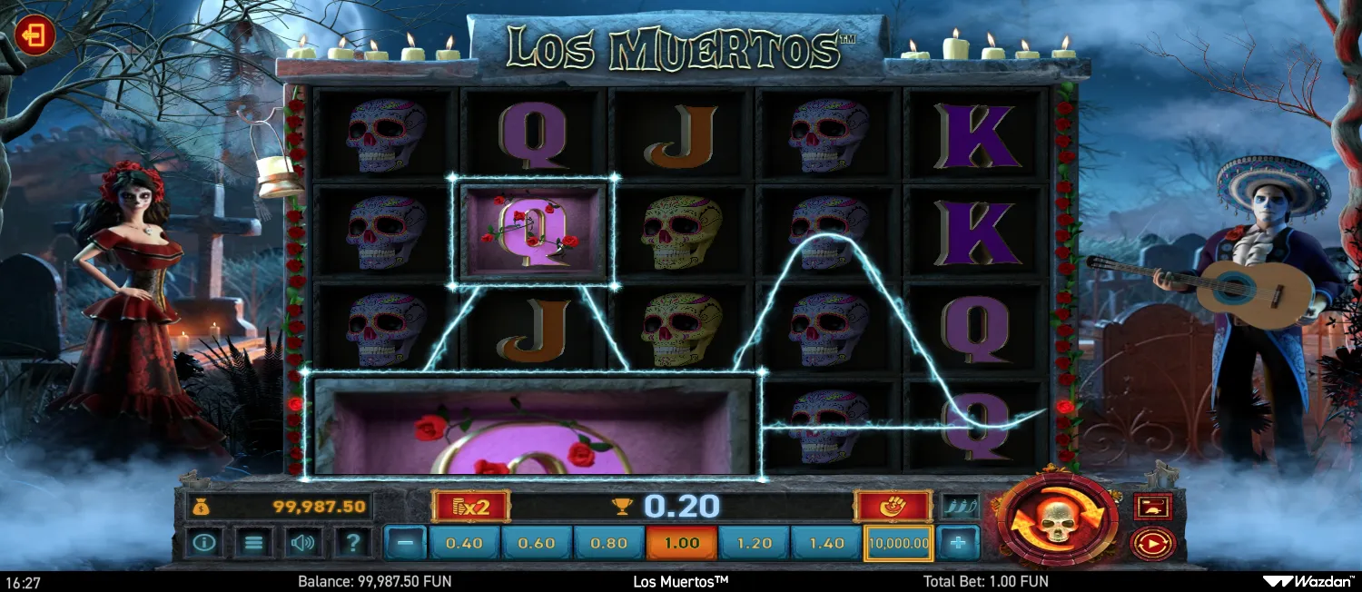 Los Muertos is classified as a variable volatility slot. This means that you can expect more frequent but smaller wins, making it ideal for extended play sessions with a smaller bankroll.