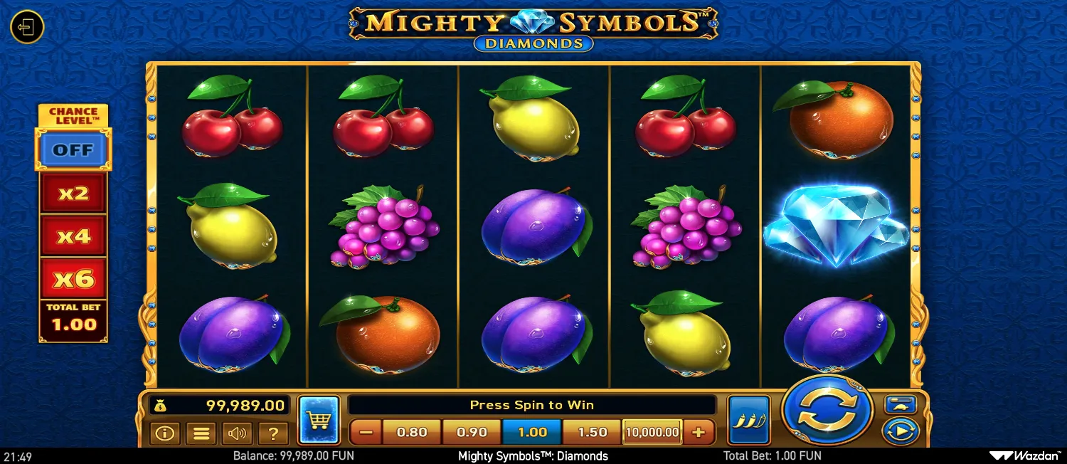 Mighty Symbols: Diamonds does not include a Bonus Buy feature. You need to trigger the bonus rounds naturally during gameplay by landing the required scatter or bonus symbols.