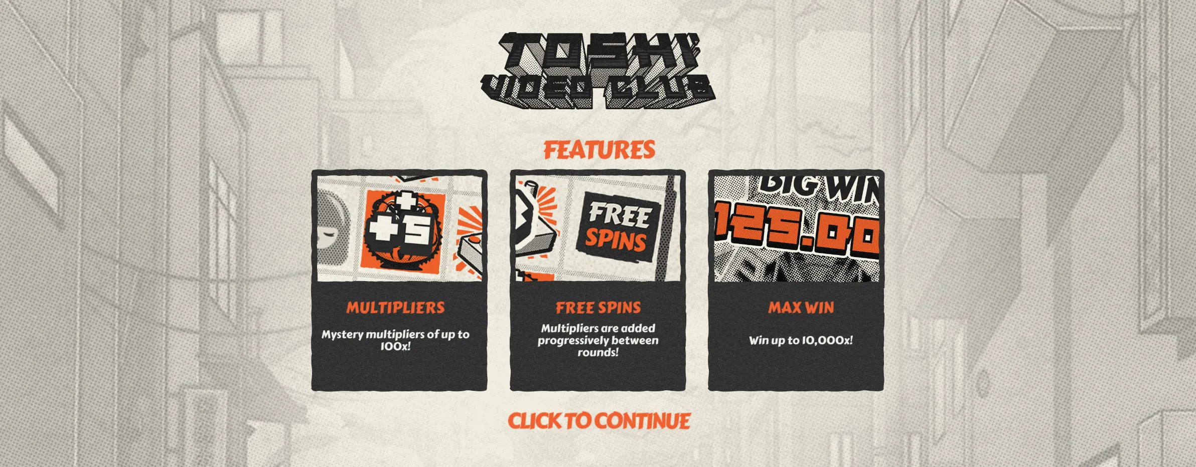 Play Toshi Video Club slot for free in demo mode. 96.17% RTP, High volatility, 10000x max win.